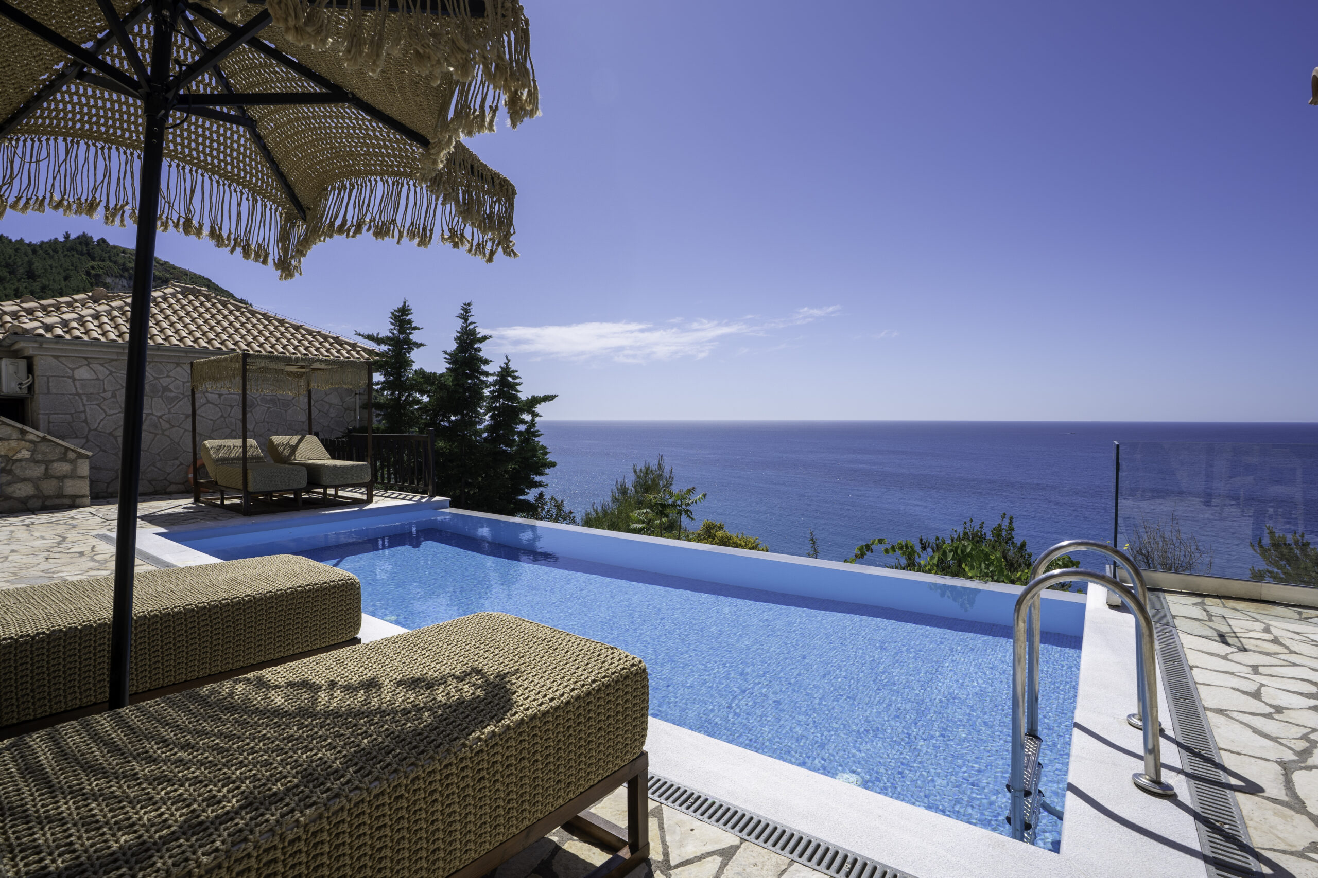 In the sitting room the sofa can be converted into a double bed. A six person dining table separates the kitchen which is fully equipped. Also, a WC is attached to it. There’s a double bed (coco-mat) bedroom and a two single beds (coco-mat) bedroom. Bathrooms are attached to both bedrooms. Villa Levanta can host up to six people. Outdoors there’s a 30 sq.m. pool with sunbeds, umbrella and six person dining table.